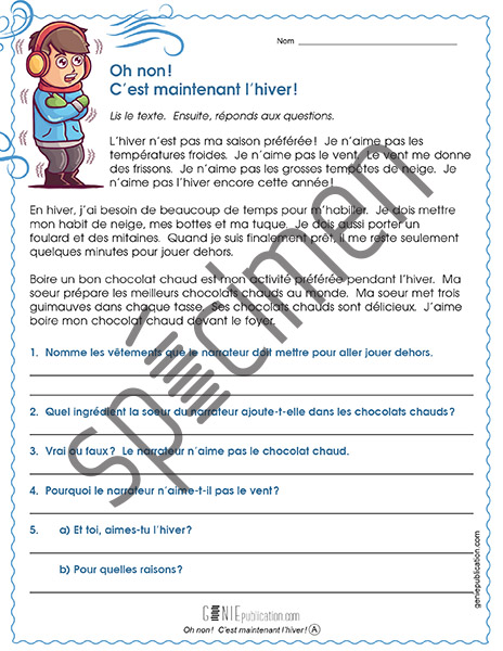 L’élève doit lire un texte sur l’hiver et répondre à des questions.