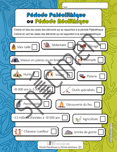 Dans cet exercice, l’élève doit identifier les éléments qui appartiennent à la période paléolithique et ceux qui appartiennent à la période néolithique.