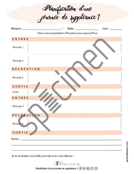 L'enseignant ou l'enseignante utilise cette feuille pour présenter au suppléant ou à la suppléante ce qu'il ou elle doit faire durant la journée avec ses élèves.