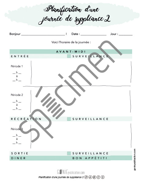 L'enseignant ou l'enseignante utilise cette feuille pour présenter au suppléant ou à la suppléante ce qu'il ou elle doit faire durant la journée avec ses élèves sur 2 pages.