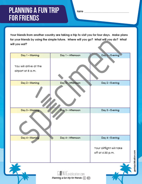 L'élève doit planifier des activités pour des amis en visite dans sa région. Il doit utiliser le simple future pour composer ses phrases.