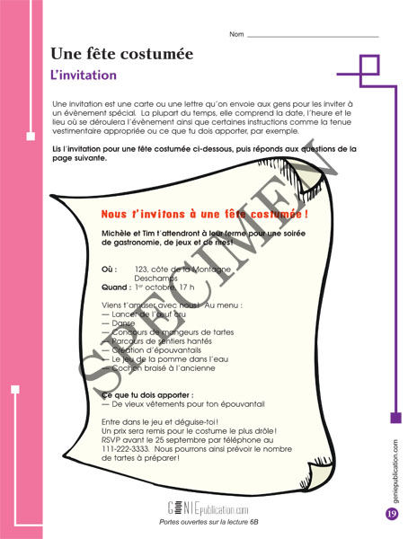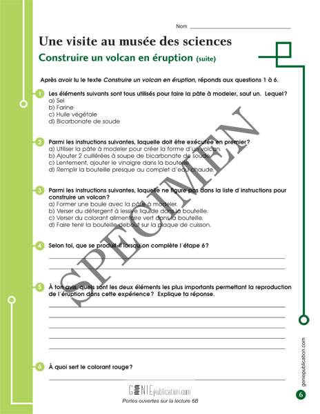 D’abord, une activité d’introduction au thème traité poussera les élèves à faire des liens, à poser des questions, à faire des prédictions et à penser à des stratégies pour améliorer leur compréhension du sujet. Ensuite, une activité de lecture leur permettra de développer leur habileté à lire avec expression, intonation et fluidité. Puis, à partir de textes courts ou longs, narratifs, poétiques, descriptifs ou informatifs, les élèves seront appelés à dégager l’information importante de leur lecture en répondant à des questions à choix multiples et à développement.