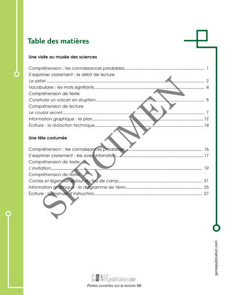 Afin de les préparer aux différentes formes de textes auxquelles ils seront confrontés dans leur vie quotidienne, chaque volume propose aussi une ou des activités de lecture sous forme de graphique. Ainsi, les élèves apprendront à décortiquer des diagrammes, des horaires, des cartes géographiques et plus encore.