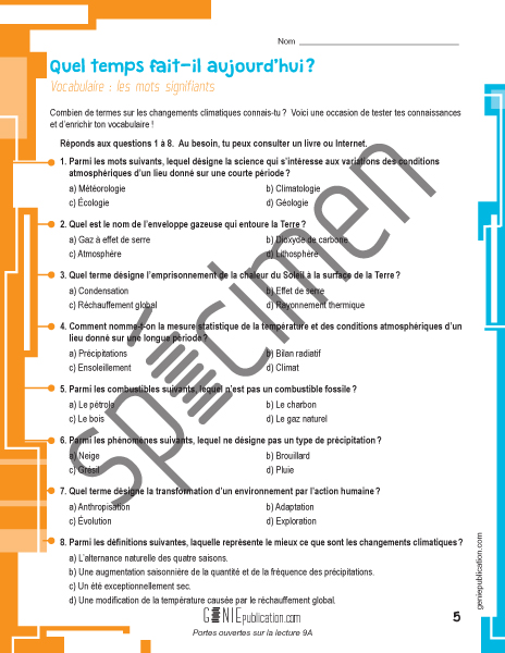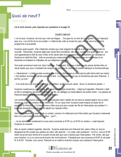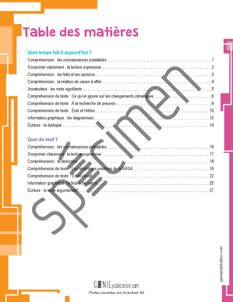 D'abord, une activité d'introduction au thème traité poussera les élèves à faire des liens, à poser des questions, à faire des prédictions et à penser à des stratégies pour améliorer leur compréhension du sujet. Ensuite, une activité de lecture leur permettra de développer leur habilité à lire avec expression, intonation et fluidité. Puis, à partir de textes courts ou longs, narratifs, poétiques, descriptifs ou informatifs, les élèves seront appelés à dégager l'information importante de leur lecture en répondant à des questions à choix multiple et à développement.