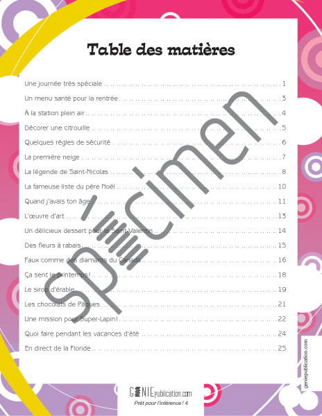 L'ordre des textes de ce volume suit la progression chronologique des différents thèmes abordés au cours d'une année scolaire. À titre d'exemple, les premiers textes porteront sur la rentrée scolaire, tandis que les derniers aborderont plutôt le thème des vacances d'été.