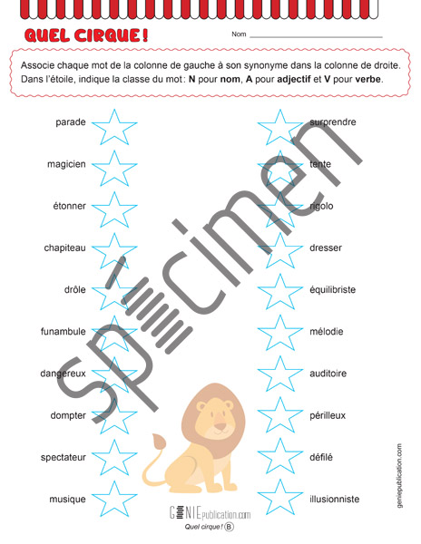 Cette activité présente une liste de mots de vocabulaire sur le thème du cirque. L’élève doit indiquer la classe de chaque mot et les relier à leur synonyme.