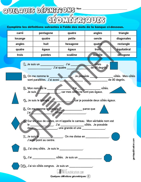 L'élève complète les définitions des figures à l'aide de la banque de mots.