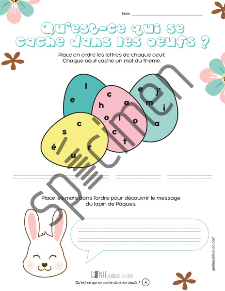 L'élève doit trouver les mots qui se cachent dans les oeufs et la phrase du lapin.