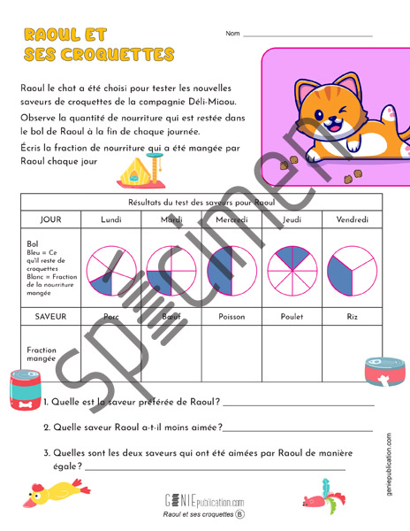 L’élève doit déterminer quelle quantité de croquettes a été mangée par le chat Raoul.
