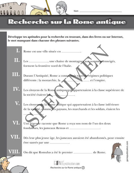 Pour réaliser cette activité sur la Rome antique, l'élève doit faire une recherche pour trouver les mots qui lui permettent de compléter chacune des phrases proposées.
