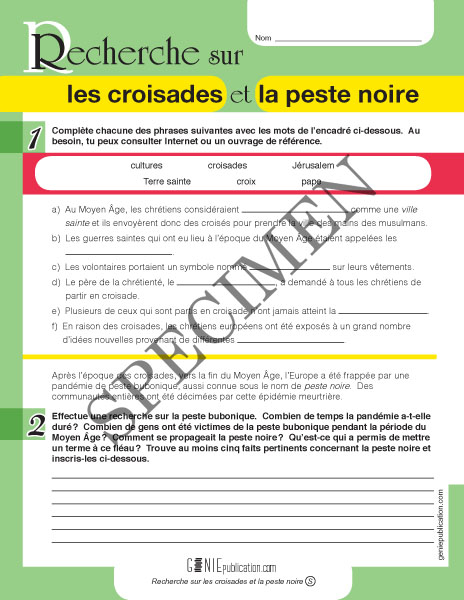 À l'aide d'Internet ou d'un ouvrage de référence, l'élève doit compléter des phrases sur les croisades et trouver de l'information concernant la pandémie de peste bubonique qui a touché l'Europe au Moyen Âge.