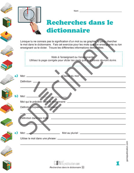 L’élève doit écouter son enseignant ou son enseignante lui dicter les différents mots. Il doit écrire les mots et les chercher dans le dictionnaire pour donner leur définition.