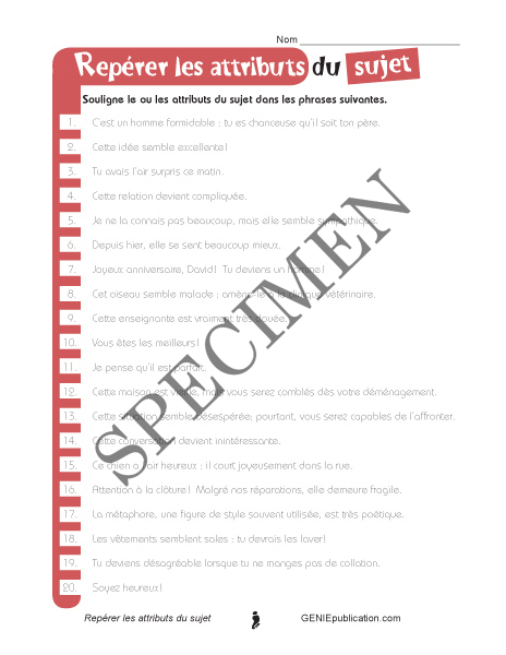 L’élève doit souligner les attributs du sujet présents dans les vingt phrases proposées.