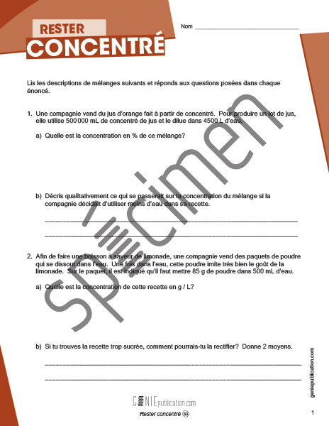 L'élève doit faire des calculs de concentration et répondre à des questions portant sur l'effet de la variation de solvant ou de soluté dans une solution aqueuse.