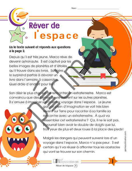 Activité dans laquelle l'élève doit lire un texte sur un voyage dans l'espace et répondre à des questions de compréhension.
