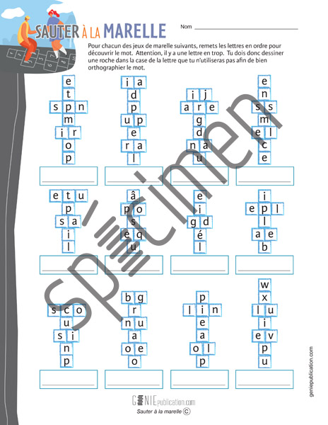 L’élève doit remettre les mots dans le bon ordre et éliminer la lettre en trop.