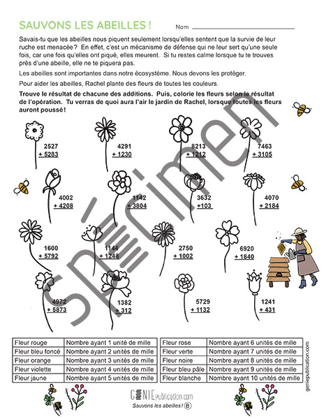 L’élève effectue les additions et colorie les fleurs de la bonne couleur en fonction du résultat obtenu. Cette activité est accompagnée d’un court texte sur le rôle des abeilles et leur importance dans le monde.