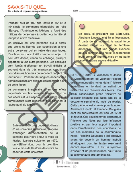 Cette compréhension en lecture présente des faits historiques sur la communauté noire au Canada et aux États-Unis. L’élève doit lire le texte et répondre à des questions de repérage, d’inférence et de réaction. Il s’agit d’une activité idéale pour aborder la question du racisme avec vos élèves.