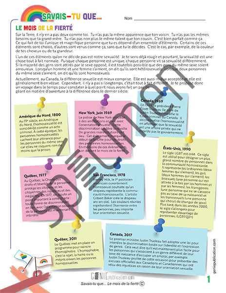 Ce texte relate de quelques évènements clés dans l’histoire de la lutte contre l’homophobie en Amérique du Nord. Il peut servir d’introduction pour amorcer une discussion en classe en lien avec le Mois de la fierté. À la suite de sa lecture, l’élève sera invité à répondre à des questions de compréhension et de réaction.