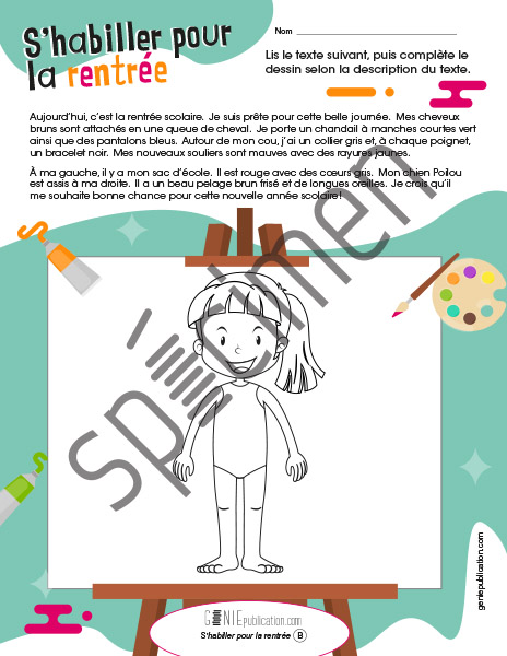 L’élève doit lire un texte et colorier les vêtements du personnage de la bonne couleur. L’élève doit également dessiner les éléments mentionnés dans le texte.