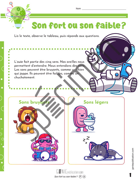 L’élève dit à quoi servent les oreilles et détermine si les sons décrits sont forts ou faibles.