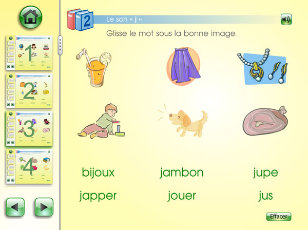 La collection d'applications Sons et images offre 15 activités interactives permettant de travailler la conscience phonologique au premier cycle du primaire. L'élève doit relier les mots de vocabulaire aux images qui les représentent. Les mots sont regroupés selon les lettres, sons et graphies qu'ils présentent et le contenu est gradué d'un chapitre à l'autre. Les élèves auront aussi la chance d'écouter la prononciation des mots de vocabulaire grâce aux fichiers audio de la narration.