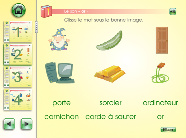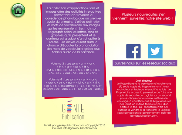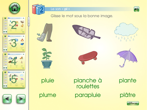 La collection d'applications Sons et images offre 15 activités interactives permettant de travailler la conscience phonologique au premier cycle du primaire. L'élève doit relier les mots de vocabulaire aux images qui les représentent. Les mots sont regroupés selon les lettres, sons et graphies qu'ils présentent et le contenu est gradué d'un chapitre à l'autre. Les élèves auront aussi la chance d'écouter la prononciation des mots de vocabulaire grâce aux fichiers audio de la narration.