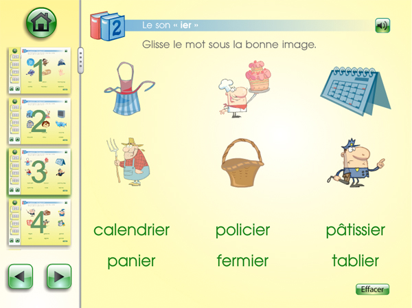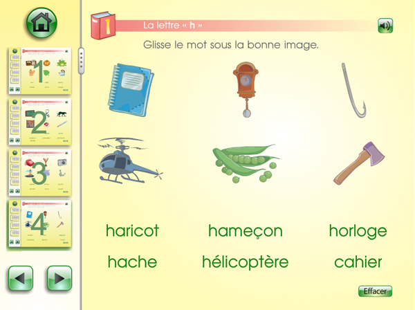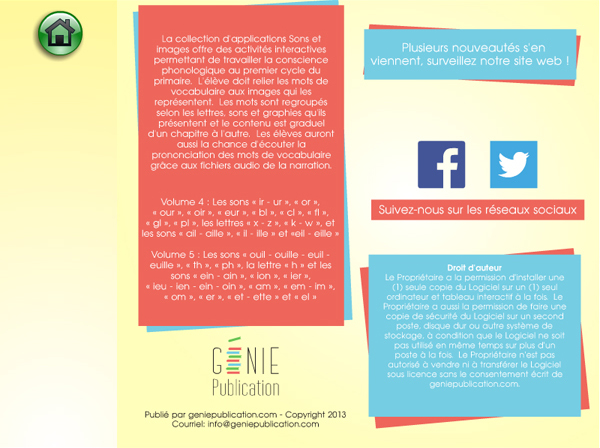 La collection d'applications Sons et images offre 15 activités interactives permettant de travailler la conscience phonologique au premier cycle du primaire. L'élève doit relier les mots de vocabulaire aux images qui les représentent. Les mots sont regroupés selon les lettres, sons et graphies qu'ils présentent et le contenu est gradué d'un chapitre à l'autre. Les élèves auront aussi la chance d'écouter la prononciation des mots de vocabulaire grâce aux fichiers audio de la narration.
