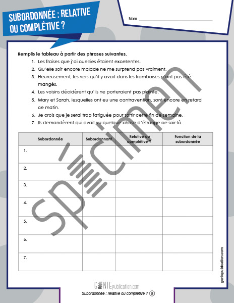 Exercice dans lequel l'élève doit trouver la subordonnée, déterminer s'il s'agit d'une subordonnée relative ou complétive, et identifier sa fonction.