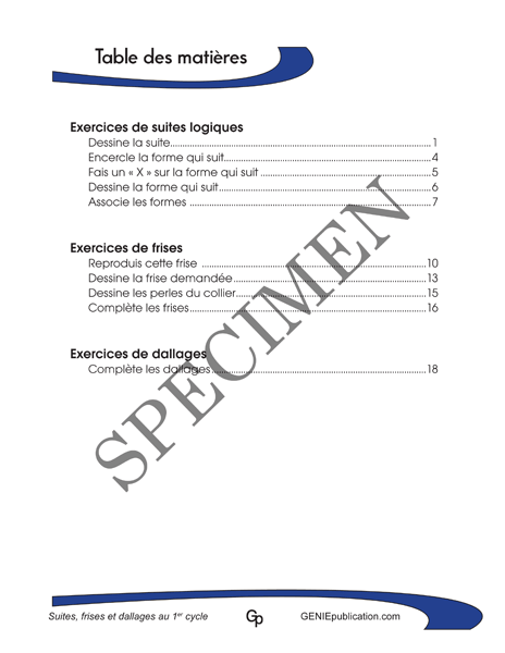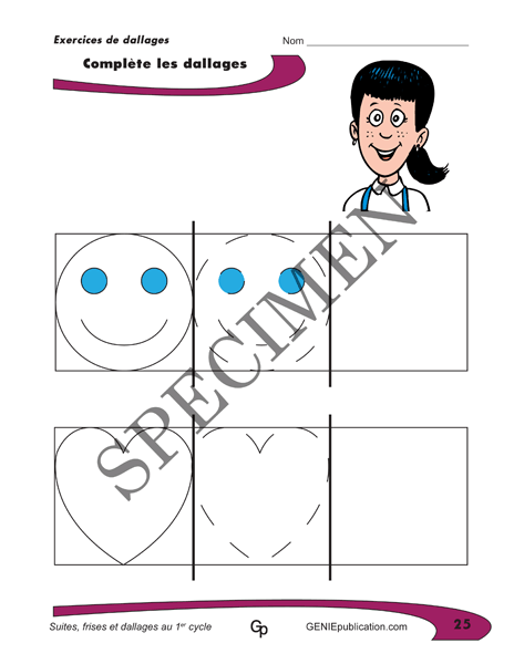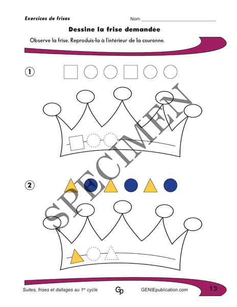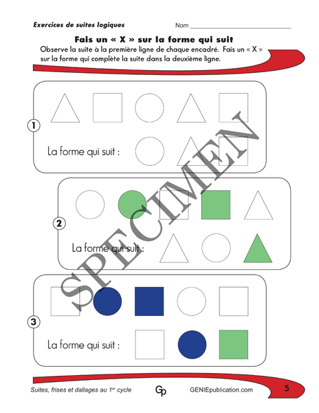 Les élèves du premier cycle développeront leur logique et leurs habiletés manuelles avec le document Suites, frises et dallages au 1er cycle. Dans ce cahier d’exercices pédagogique, vous trouverez d’abord neuf pages d’activités sur les suites qui permettront à l’élève d’utiliser sa logique pour déterminer les parties manquantes. La seconde partie propose, quant à elle, huit pages de frises à compléter à l’aide de bricolages et de dessins. L’élève fera ensuite progresser sa logique et ses habiletés manuelles en traçant différents dallages. Huit pages sont consacrées à cette troisième et dernière partie, qui complète un document de 25 pages d’activités stimulantes pour vos élèves.