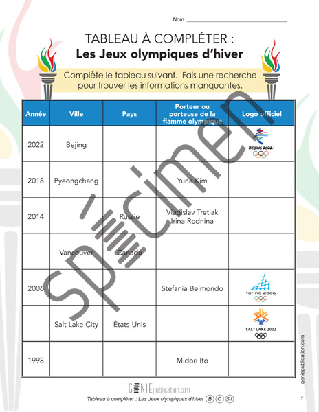 Tableau à compléter : Les Jeux olympiques d'hiver