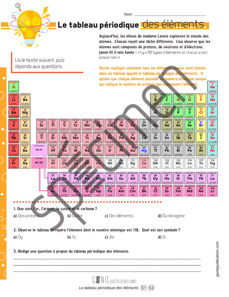 L’élève lit un texte sur le tableau périodique des éléments, observe le tableau et répond à des questions.