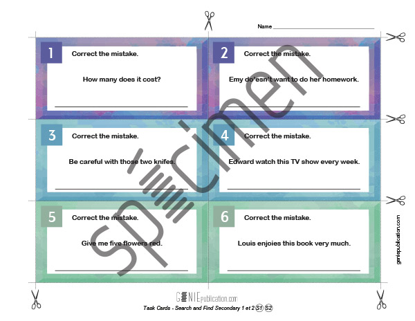 Ensemble de 40 cartes à tâches. Chaque carte présente une phrase contenant une erreur d'orthographe ou de grammaire. Les élèves peuvent répondre individuellement, en petit équipe ou en grand groupe. Le corrigé se trouve sur la dernière page.