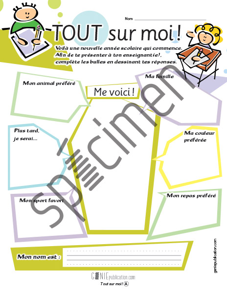 L'élève doit dessiner son portrait et illustrer ses préférences sur la fiche. Cette activité est utile en début d'année pour apprendre à connaitre ses élèves.
