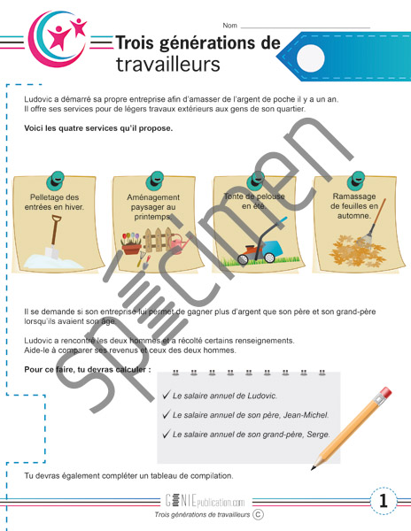 L'élève doit résoudre une situation-problème pour trouver la différence entre le salaire d'un jeune homme, de son père et de son grand-père.