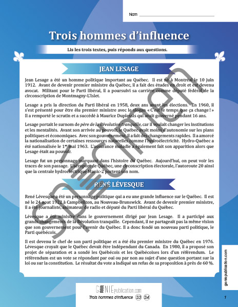 Activité de compréhension en lecture à saveur historique portant sur Jean Lesage, René Lévesque et Honoré Mercier.