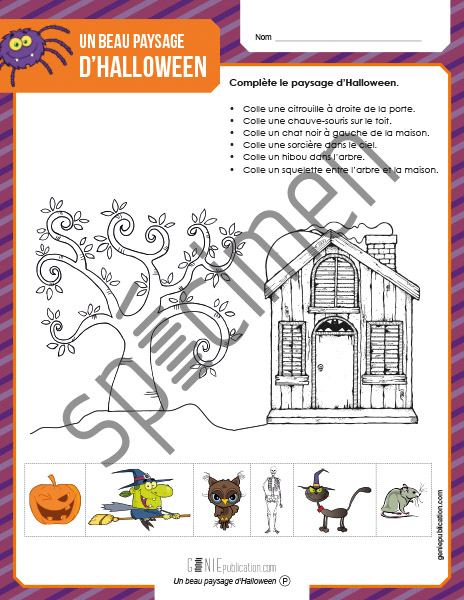 Activité sur le thème de l'Halloween dans laquelle l'élève doit coller des objets selon les instructions.