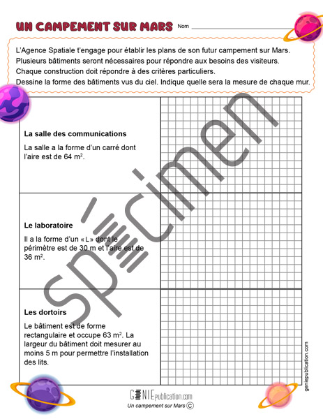 L’élève doit dessiner les formes des bâtiments qui seront construits lors d’une mission sur Mars et indiquer les bonnes mesures à partir des informations données.