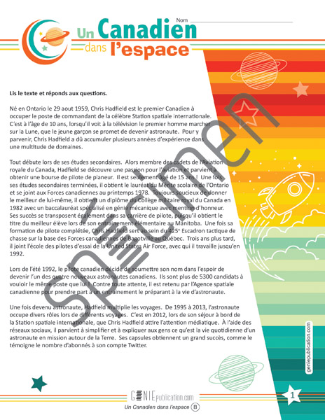Activité dans laquelle l'élève doit lire un texte informatif sur l'astronaute Chris Hadfield et répondre à des questions.