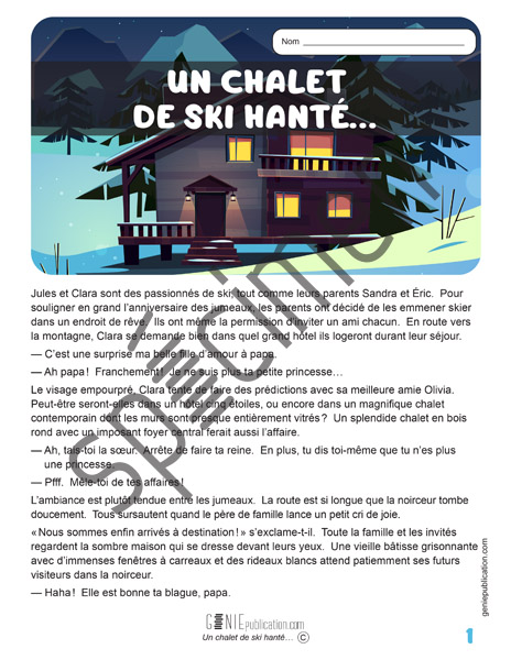 Le père de Clara et Jules a loué un vieux chalet lugubre pour le voyage de ski familial. Malgré la crainte des enfants, la famille passera la nuit à cet endroit. Le chalet est-il vraiment hanté ? La fin ouverte qu’offre ce texte amènera l’élève à se poser la question.