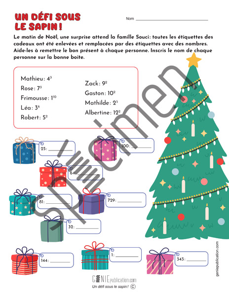 L’élève doit calculer la puissance des nombres pour trouver à qui appartient chaque cadeau sous le sapin.