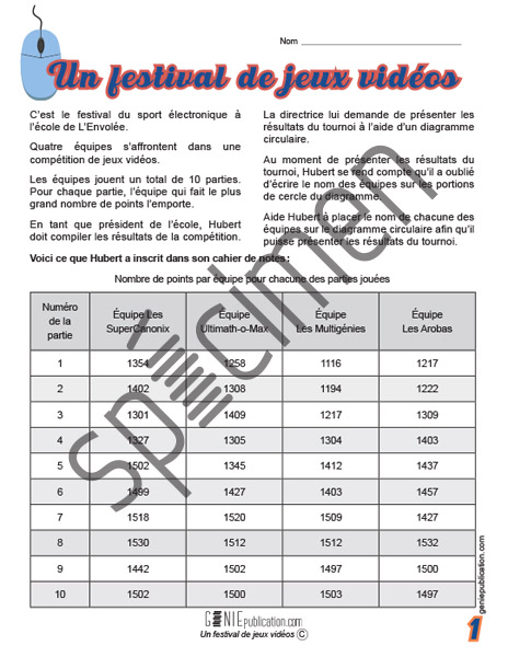 Une compétition de jeux vidéos a eu lieu à l’école. Hubert doit compiler le pourcentage de victoires des équipes dans un graphique circulaire, mais il a oublié de noter le nom des équipes dans son graphique. L’élève doit aider Hubert à trouver le pourcentage de victoires de chaque équipe et associer les équipes à la bonne couleur.