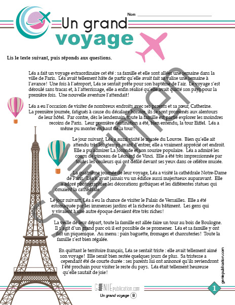 L'élève doit lire un texte sur un voyage à Paris, puis répondre à des questions.