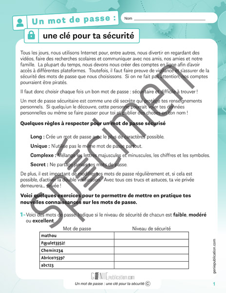 Dans cette activité, l’élève doit lire un court texte sur l’importance de la sécurité des mots de passe. Il obtiendra aussi des trucs pour choisir un mot de passe sécuritaire. Ensuite, pour mettre en pratique ses nouvelles connaissances, l’élève répond à 3 questions.