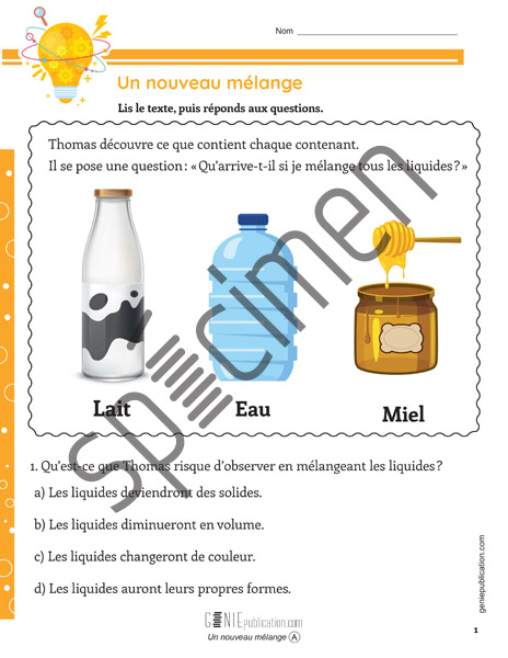 L’élève doit déterminer ce qui se produit lorsqu’on mélange de l’eau, du lait et du miel.