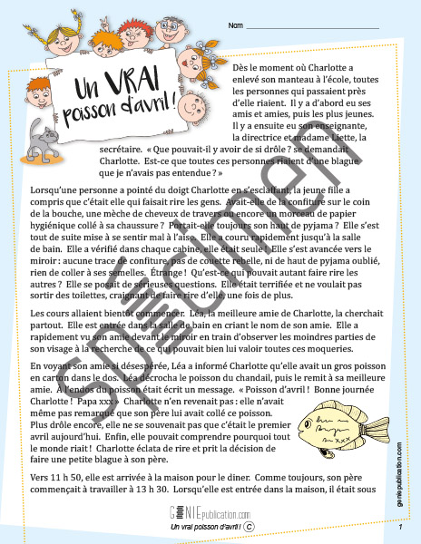 L'élève doit lire une histoire sur le poisson d'avril, puis répondre à des questions.