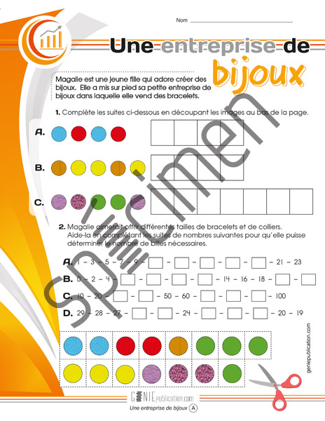 À l'aide des suites logiques, l'élève doit aider une jeune entrepreneure qui confectionne des bijoux.