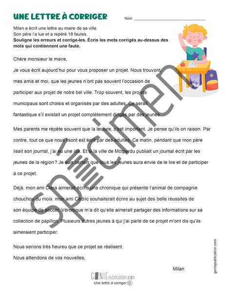 Milan a écrit une lettre pour proposer une activité au maire de sa ville, mais il a laissé plusieurs erreurs. L’élève doit trouver et corriger les erreurs dans un court texte.