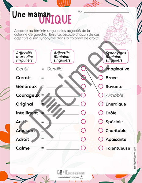 Une activité parfaite pour la fête des Mères ! Dans cet exercice, l’élève doit accorder des adjectifs au féminin singulier et les associer à leur synonyme. Puis, il identifie les adjectifs qui font de sa mère une personne unique en justifiant ses réponses à l’aide d’exemples de son quotidien. En terminant, l’élève rédige une lettre pour la fête des Mères.
