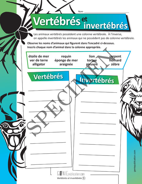 L’élève doit catégoriser les animaux d’une liste selon qu’ils sont vertébrés ou invertébrés.
